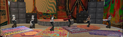 Shockwave would express his appreciation to the crowd, "All of you, thank you so much for coming out. We love entertaining you and fighting cancer." When a latecomer to the party asked what all the 60s decor was about, Shockwave answered, "This event is a recreation of Woodstock," then mentioning his furry friends, "with even MORE hair. ... I wasn't at the real thing. But I love this one more, because all of you are here. We are getting close to a real cure for cancer. So tantalyzing close. I may yet live long enough to see a cure for cancer and bases on the moon. My kids get to have the adventure I wanted."Shockwave then brought up the team's weekly event, "For those in the audience, the Sunbeamers have a dance on the moon every Thursday. Everyone is welcome. We have a variety of music. And the aliens haven't hurt anyone yet. Come join us if you want -- no pressure." Shockwave grinned, then noticed his joke about the lack of air pressure on the real moon might have gone unnoticed, "That pun was bad, eh?"Among those in the audience were a few from team "Roos With A Dream." When one latecomer arrived, another would say, "Glad to see my Roolief arrived." Another would give the tail of a Sunbeamer in the audience a big hug. Then another turned to the stage, " 'roos love the beamers!" Then she would comment about the dancers, "Wow! its Cynthia and the Cynthettes!" Shockwave would comment, "Cynthly Irresistable!" "Ooh, I like that! Cynthia and the Cynthetics." "If you like the music of the past," Shockwave went on, "let's try making Cancer a thing of the past also. Jump in the mud! Kick up your heels! So this blast from the past is the next big thing -- Cynthia and the Cynthetics!"